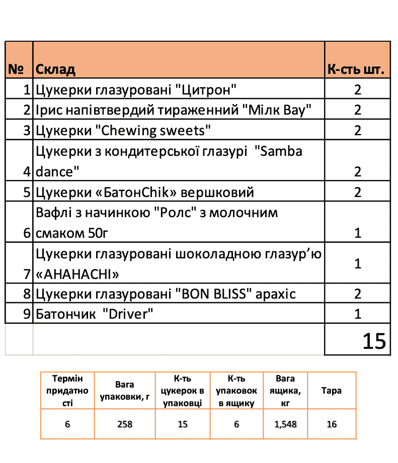 Загальна кількість кондитерських виробів – 15 шт